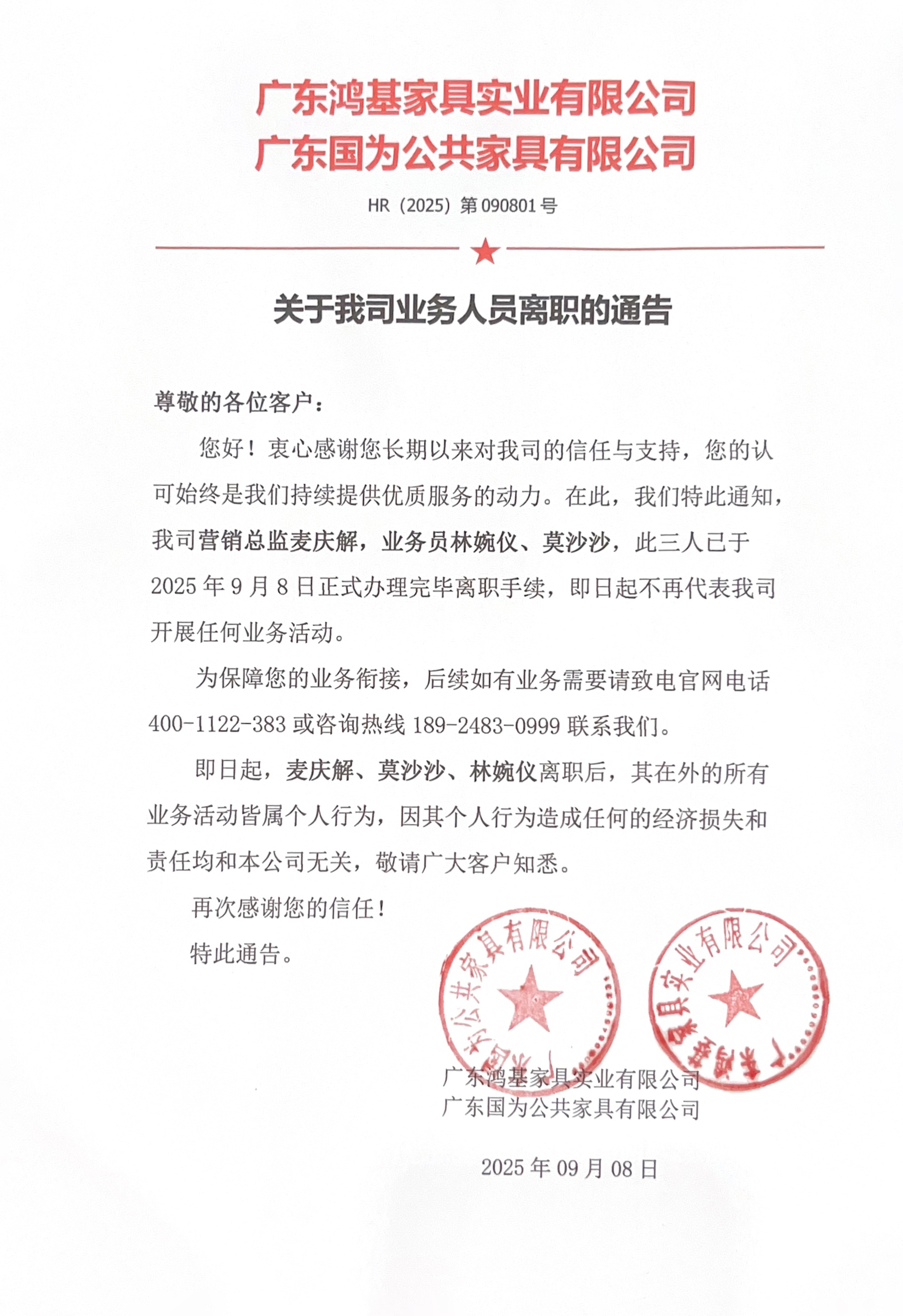 【溫馨提示】關(guān)于我司業(yè)務(wù)人員離職的通告
