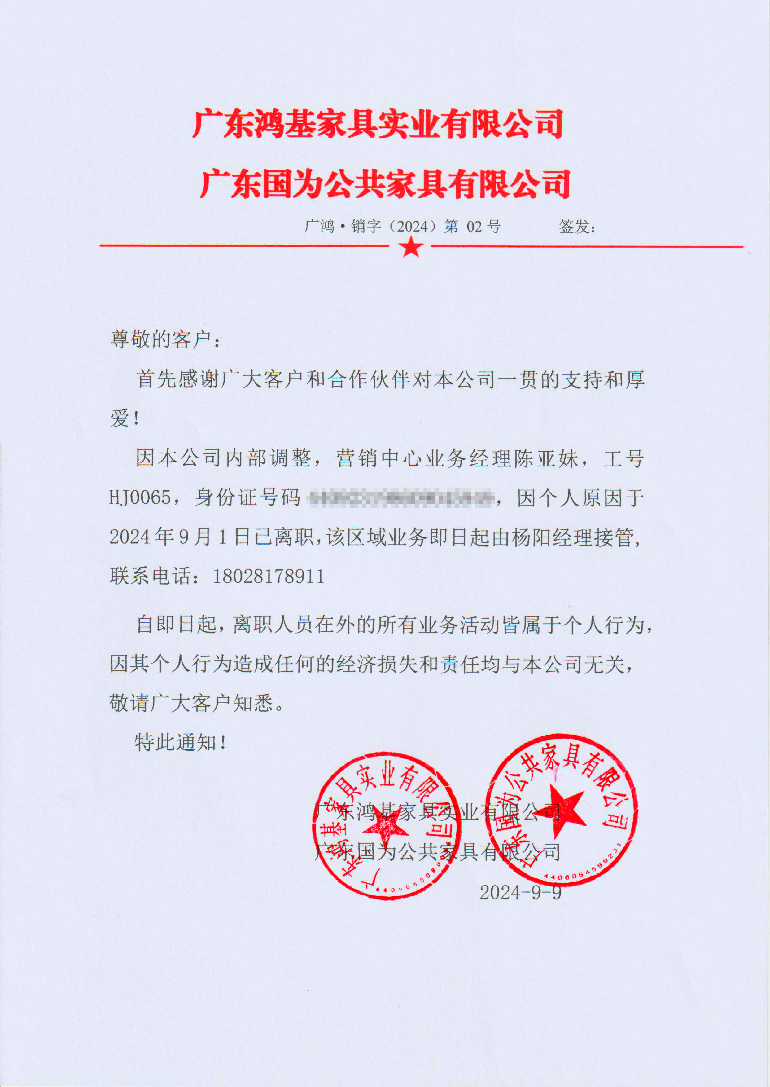 【溫馨提示】營銷人員離職告知函