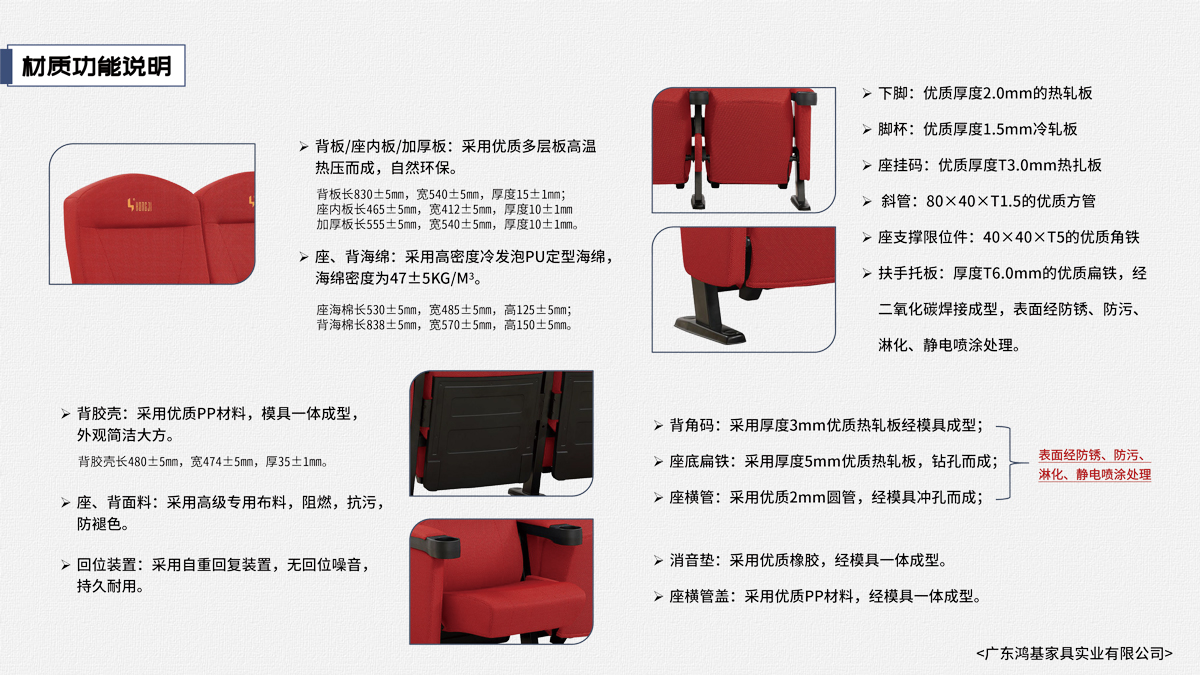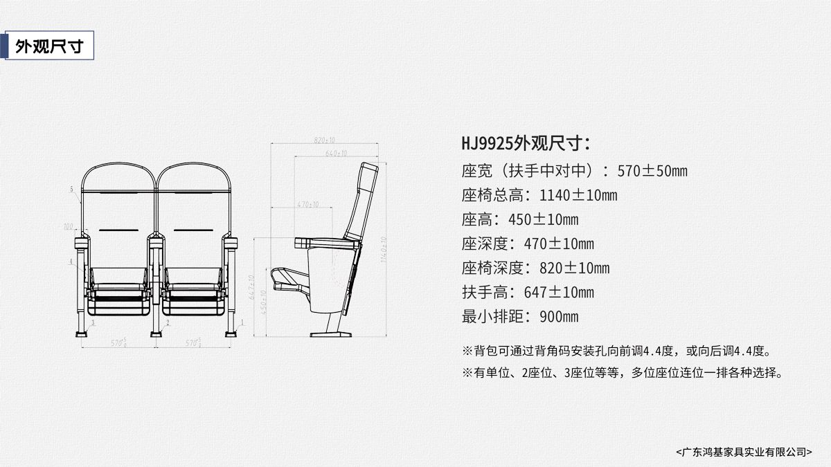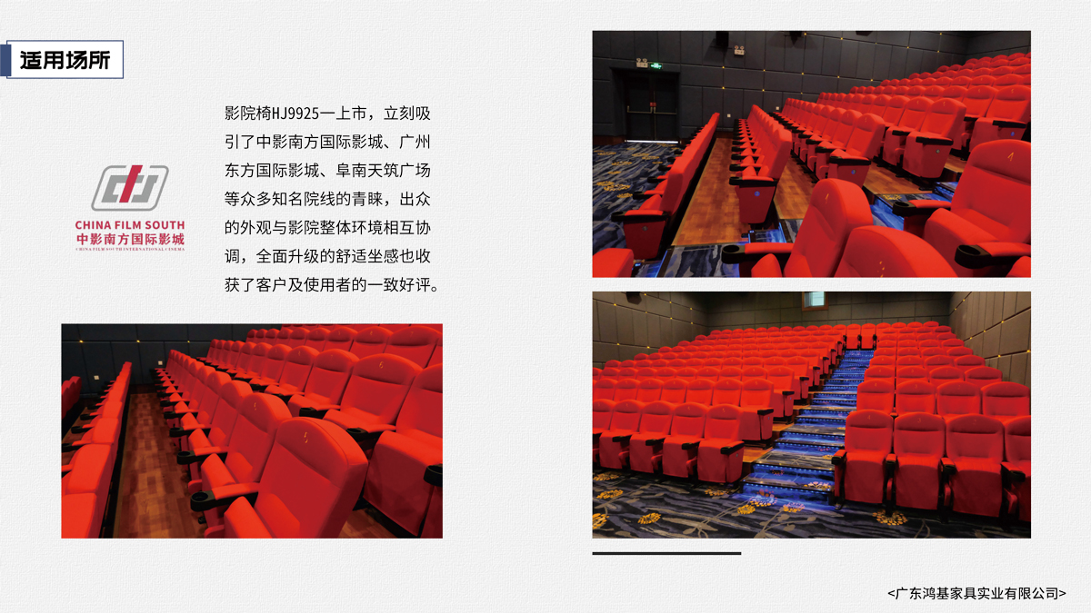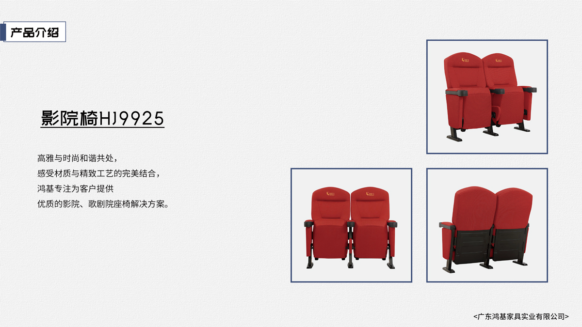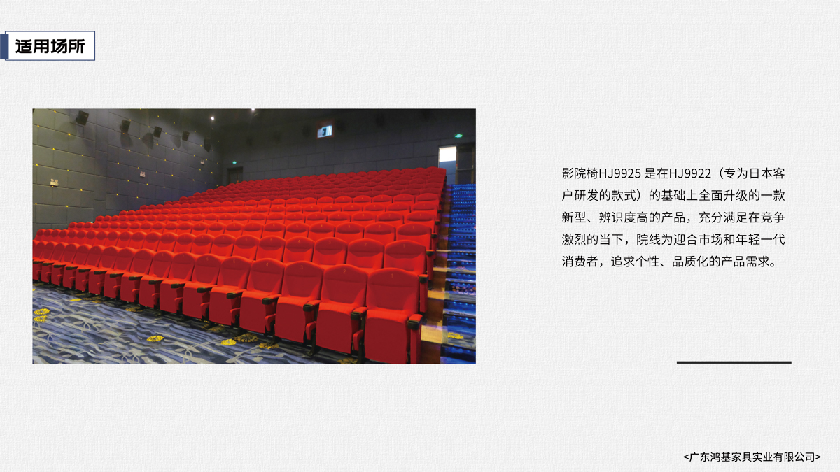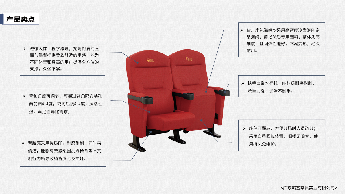 該座椅的設計已獲國家外觀設計專利,座椅座感舒適,符合人體工程學原理,安裝、維修方便。采用高檔柔性面料和高密度超軟PU冷發泡定型海綿,座椅整體造型外觀飽滿,精致大方。可為影院、禮堂、歌劇院等最佳首選之一。